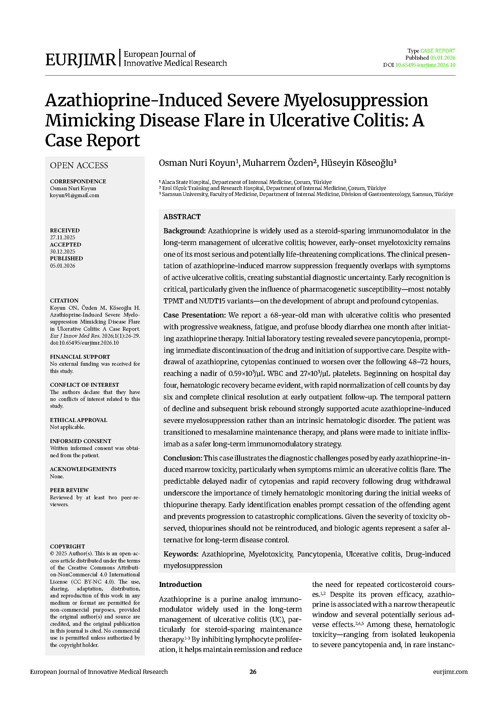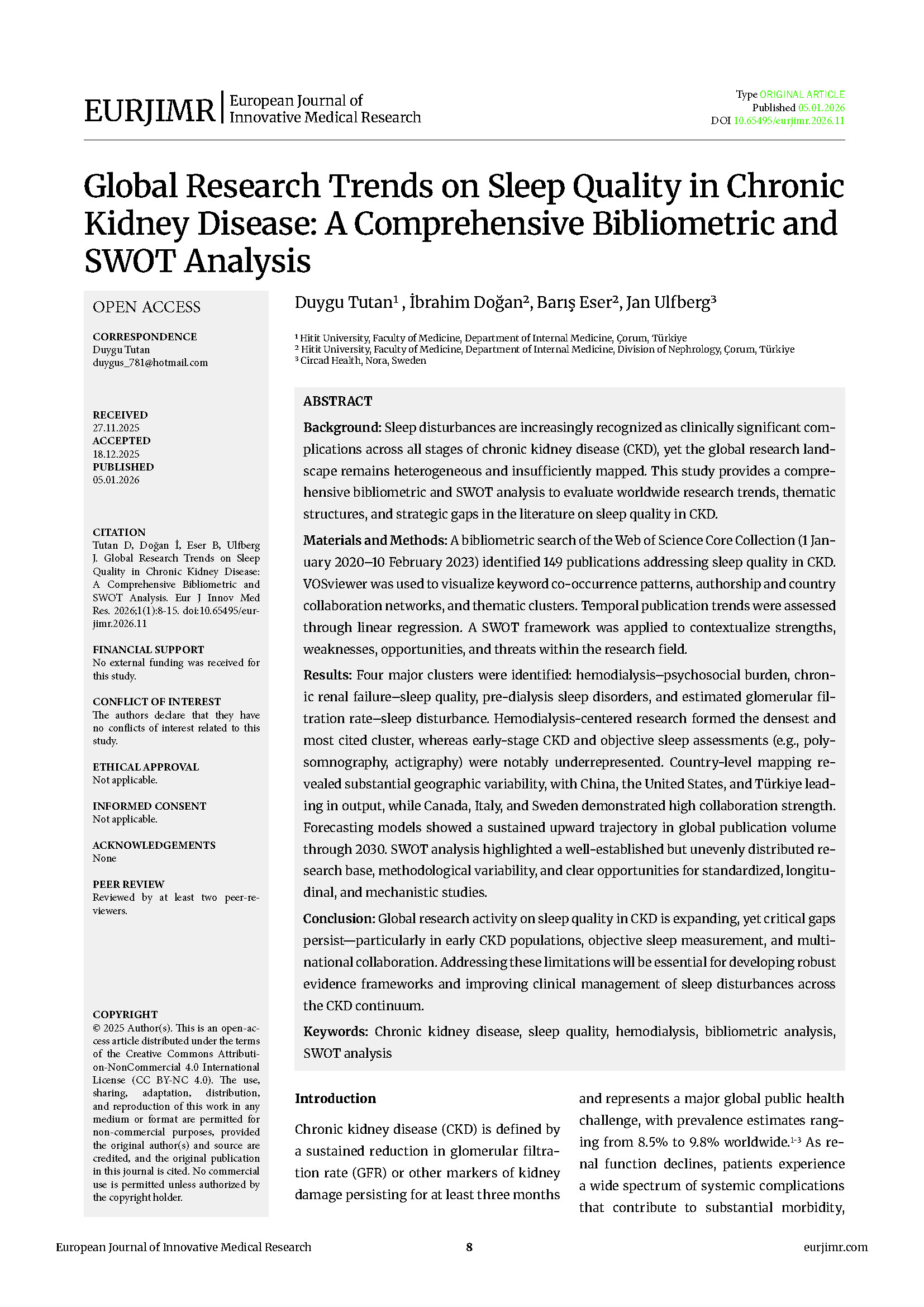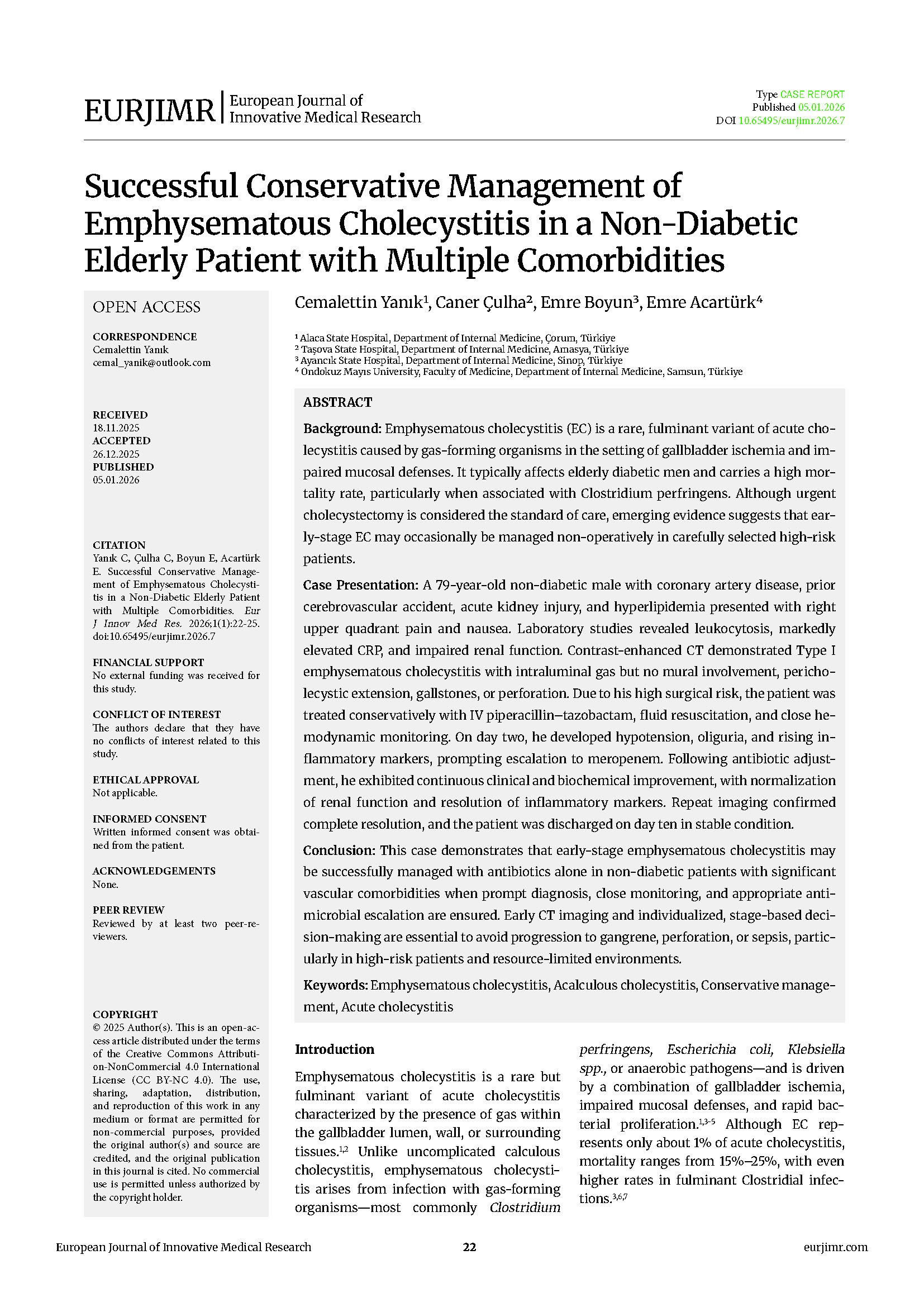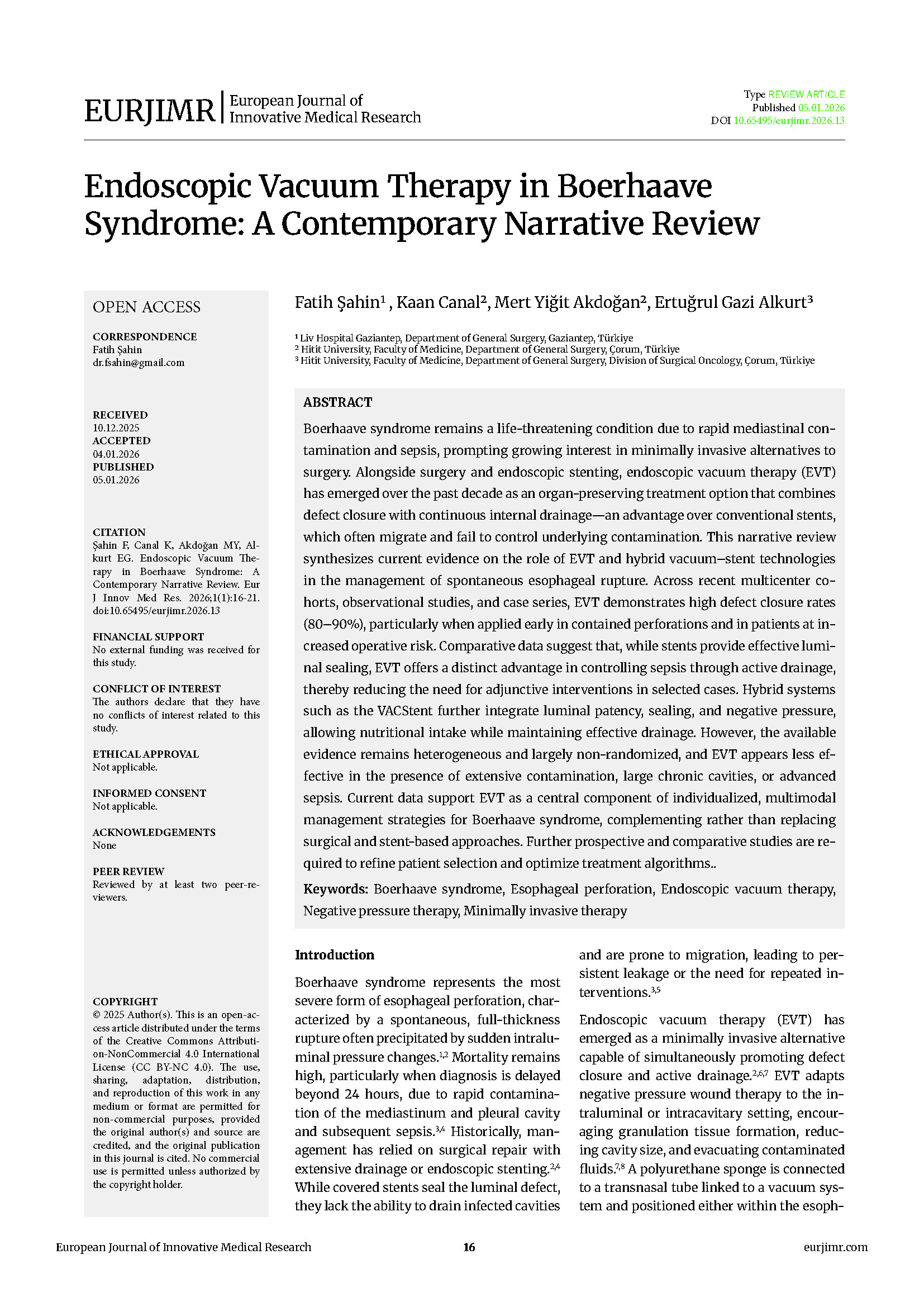 The first issue of European Journal of Innovative Medical Research marks the launch of a multidisciplinary platform dedicated to advancing high-quality scientific research with clinical relevance. This inaugural issue brings together original studies, reviews, and perspectives that reflect the journal’s commitment to methodological rigor, innovation, and ethical scholarship. By fostering dialogue across specialties and research traditions, EURJIMR aims to contribute meaningfully to evidence-based practice and academic development at both regional and international levels.